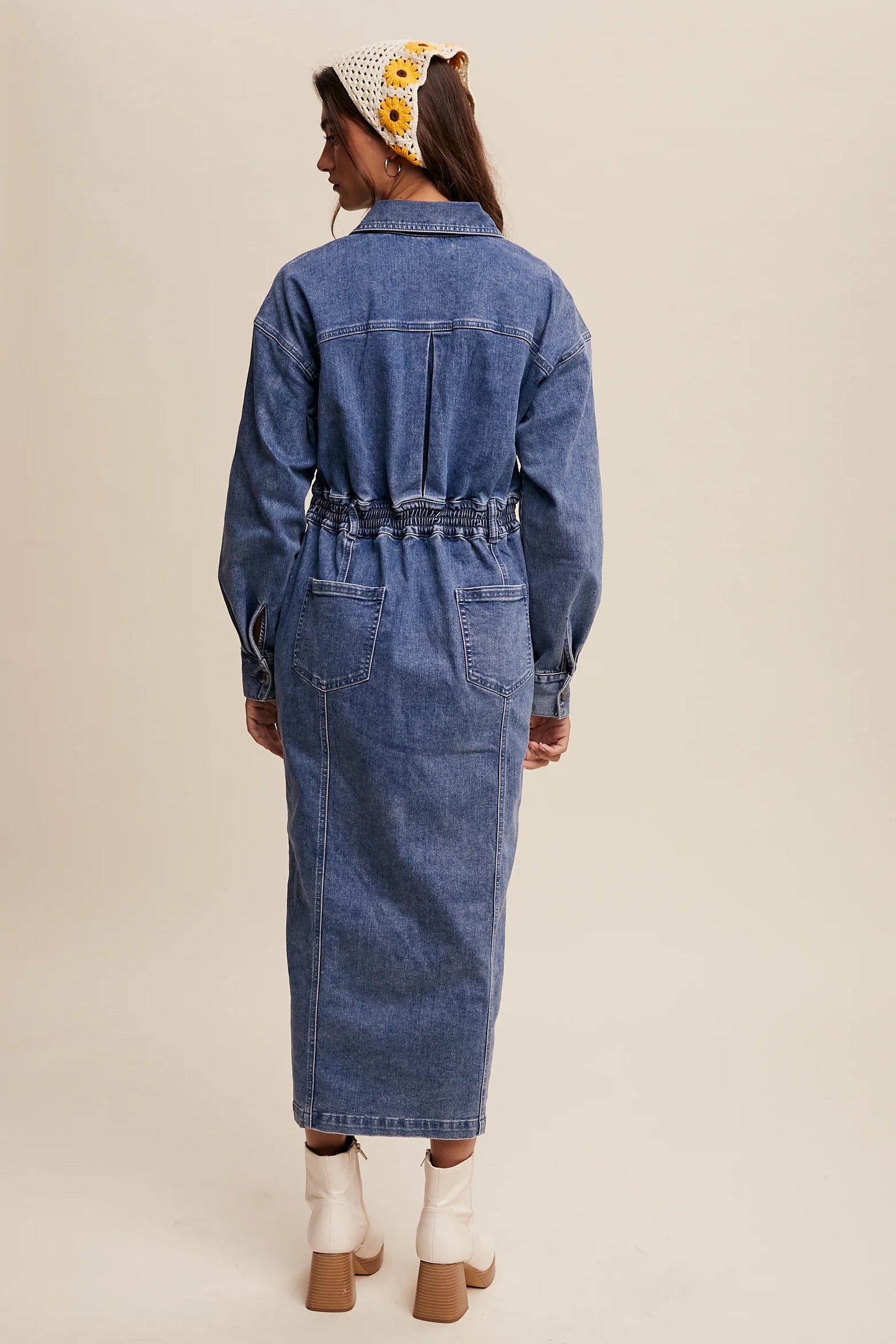 Elevate your everyday look with the Utility Denim Maxi Dress—a perfect fusion of function and fashion. Designed for the modern woman who values both comfort and style, this dress features a sleek, full-length silhouette in durable yet soft denim. The practical utility-inspired design includes multiple front pockets, a flattering belted waist, and adjustable straps, giving you the freedom to style it your way while keeping essentials close at hand.