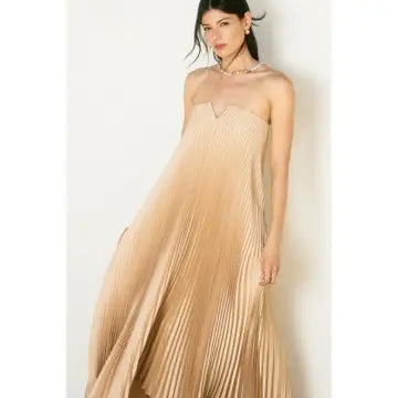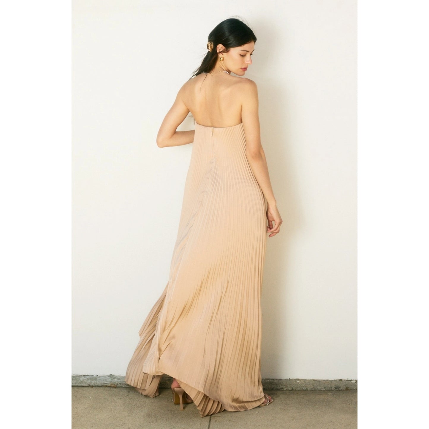 Ethereal elegance in a simple column. Pleated maxi length in shimmery Champagne tones, the perfect dress for holiday festivities or weddings. Simple breathtaking.