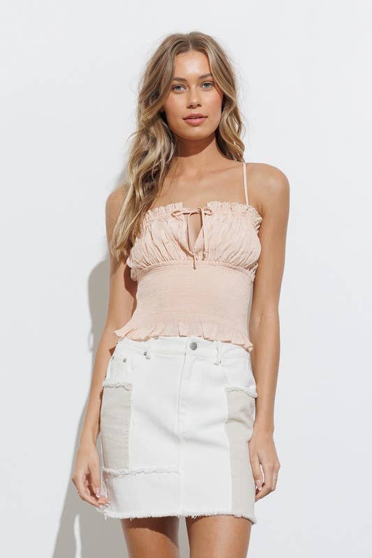 The RACHEL Smock -Lace Trim Smocking Cami Top with tie-front detail and cropped at the waist.
