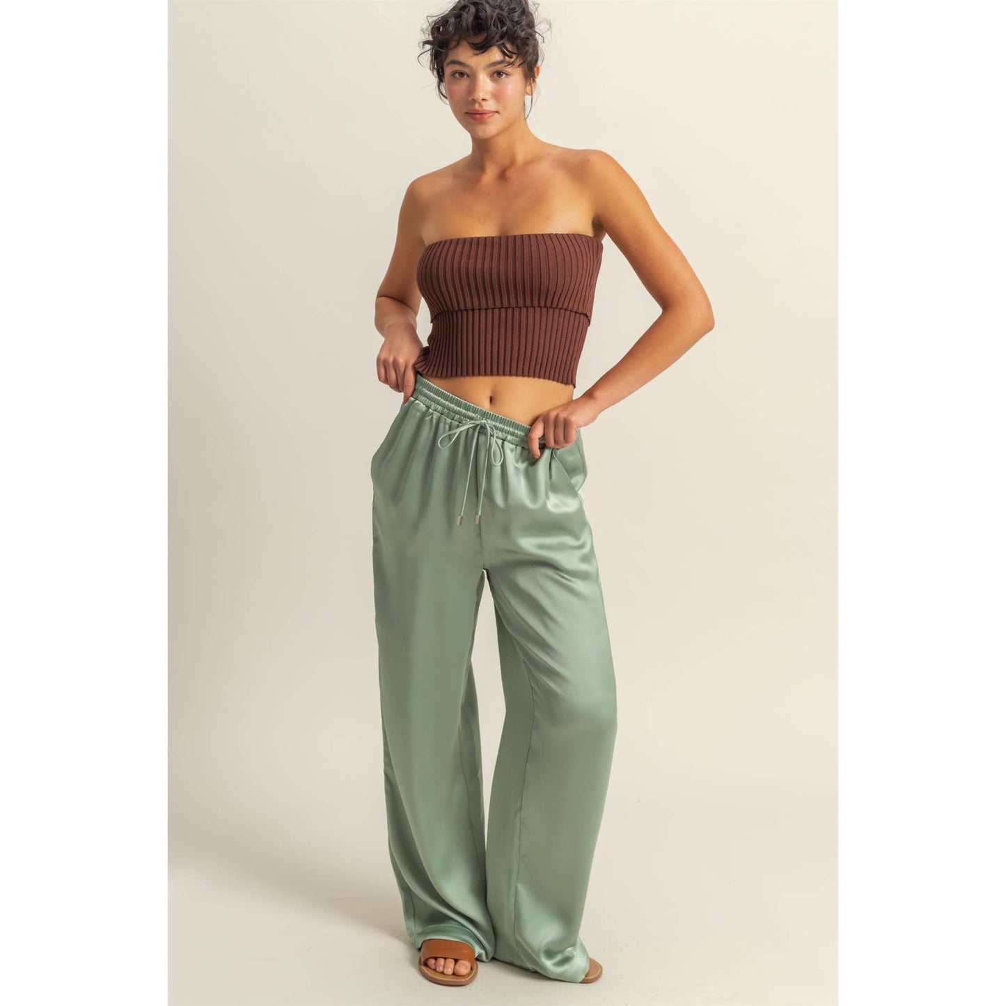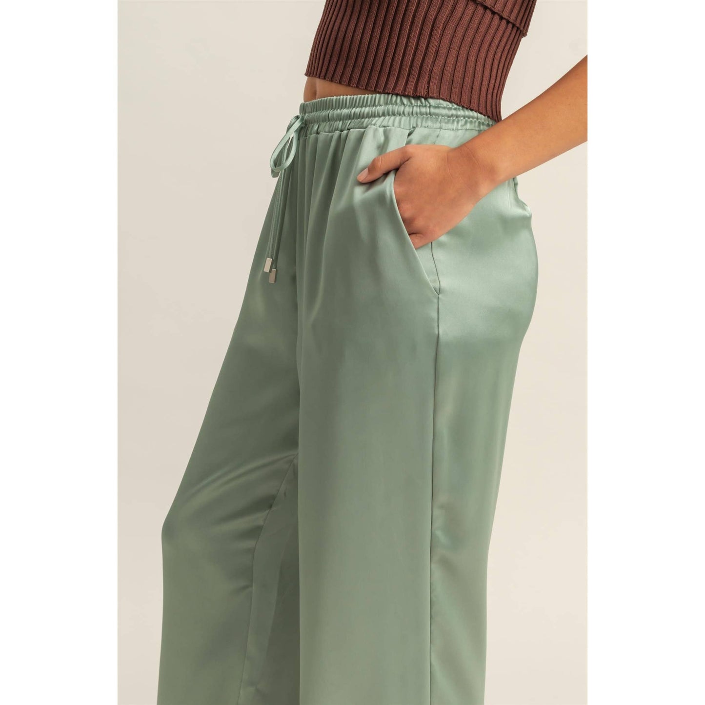 Wideleg Satin Drawstring Pant