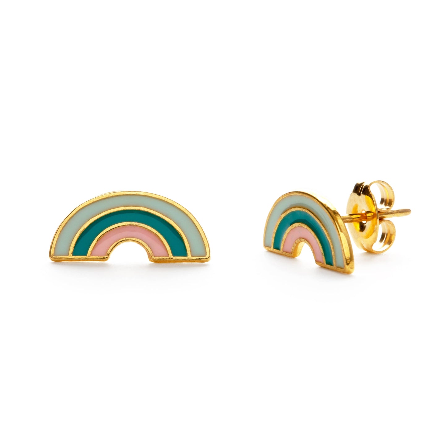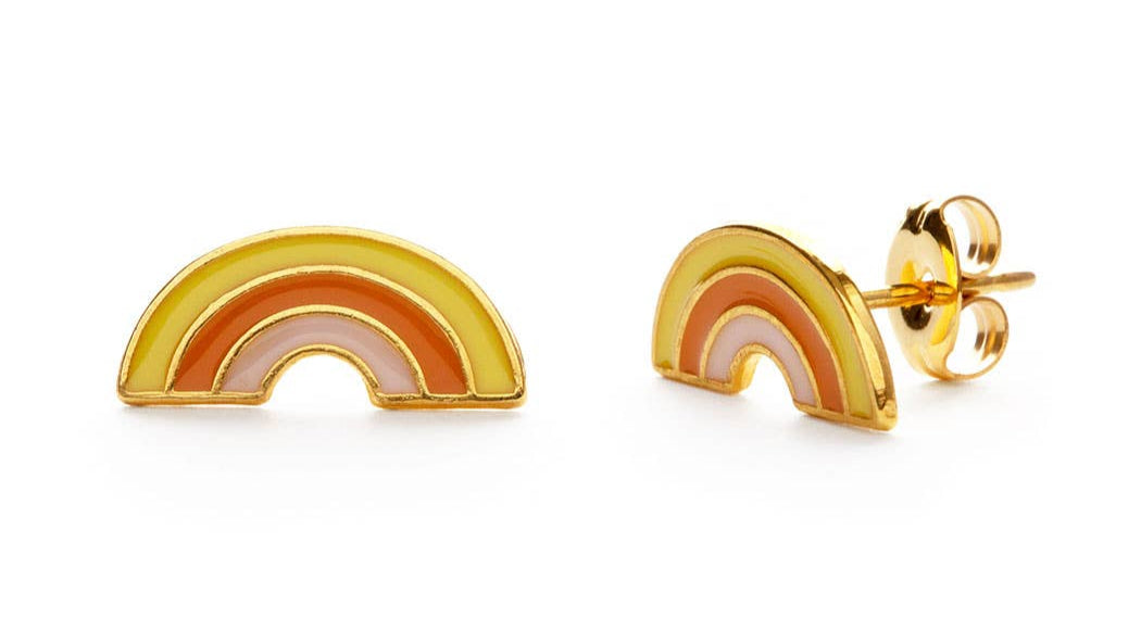 If these little retro color rainbows don’t make you happy, nothing will! They measure approximately 1/2" and are made of gold plated brass (heavy 7-10mil 24k gold) hand painted with enamel. Made with a vintage 80’s mold and reproduced in the USA.