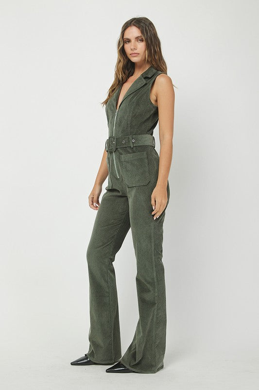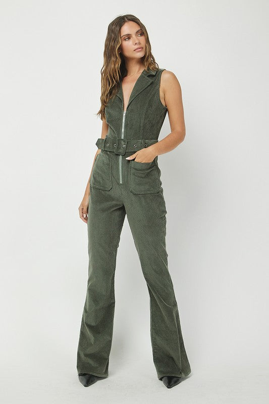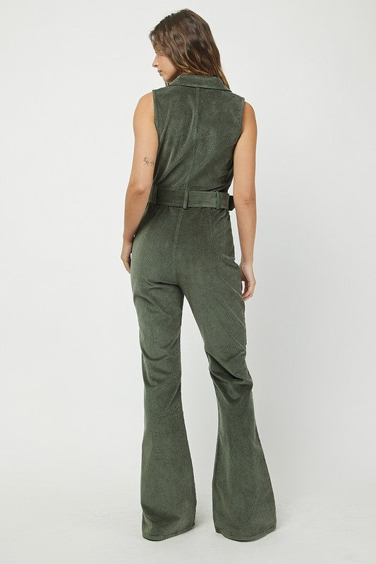 Step into effortless style with the Verdant Vibe Jumpsuit. This sleeveless piece, crafted from soft and stretchy corduroy, offers both comfort and sophistication. The collared design and front zipper add a touch of classic elegance, while the detachable belt with a buckle cinches the waist for a tailored look. Flared leg details enhance the silhouette, creating a chic and flattering profile. Perfect for making a statement, the Verdant Vibe Jumpsuit effortlessly combines trend-setting fashion with everyday ease.
